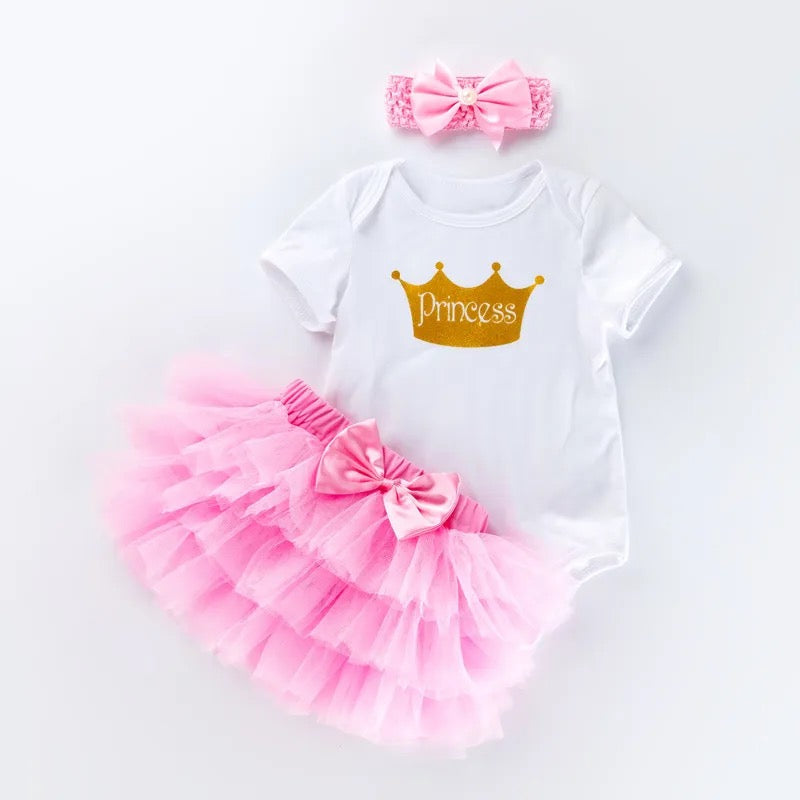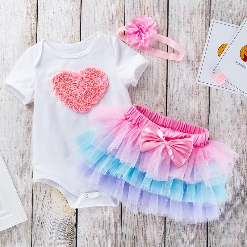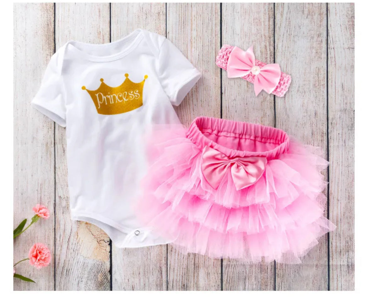 Hermoso set de 3 piezas para niñas. Camisa en algodón manga corta. Falda en tul (mesa) y lazo.