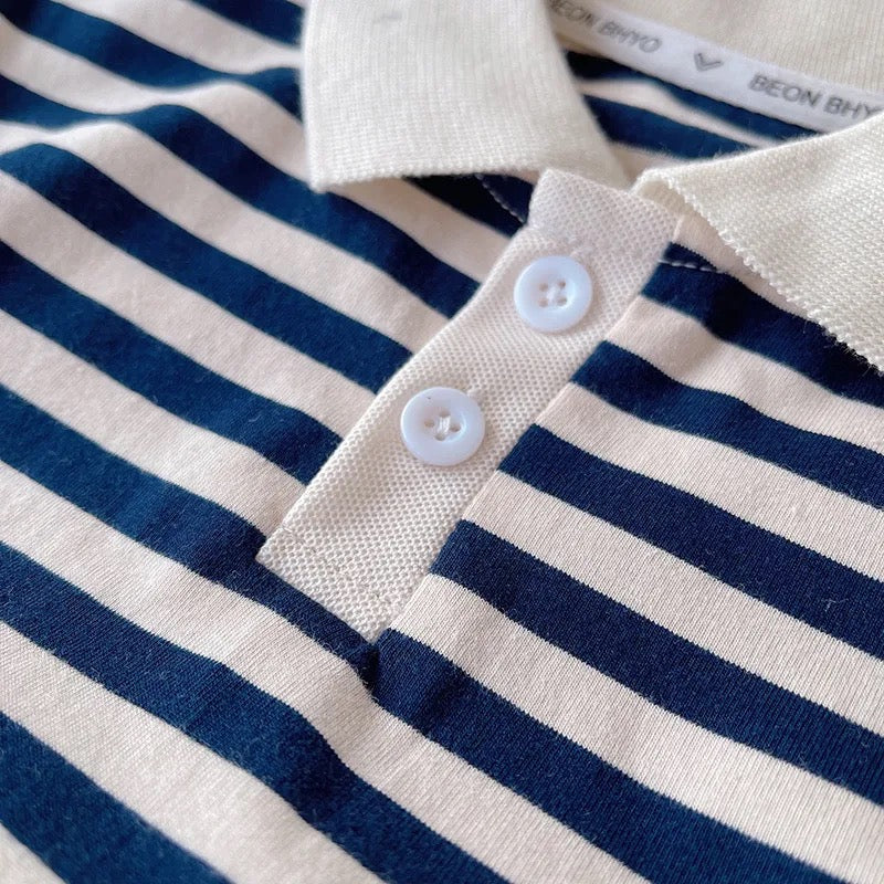 Set de polo con líneas azules y blancas con osito tejido. Pantalón corto con bolsillos.