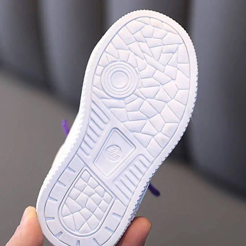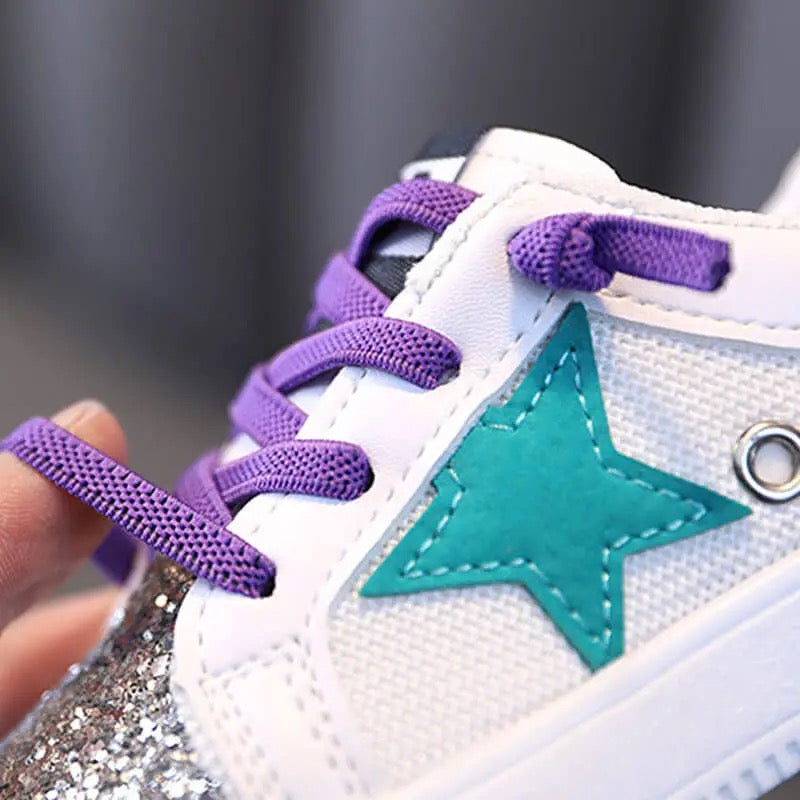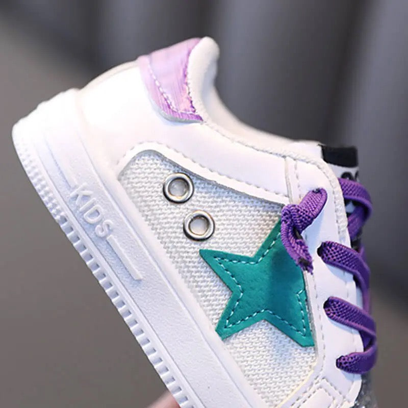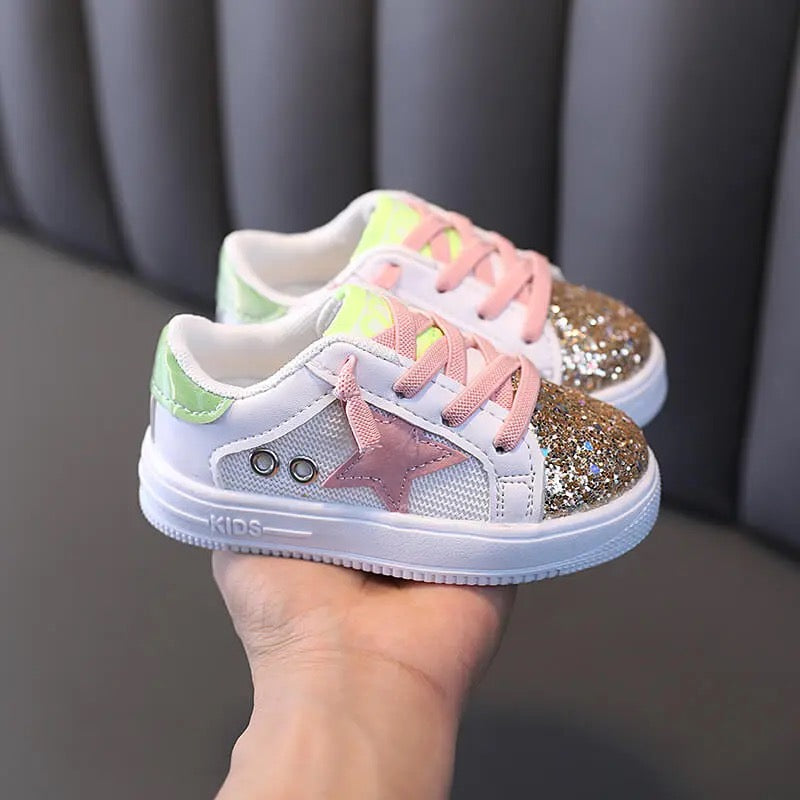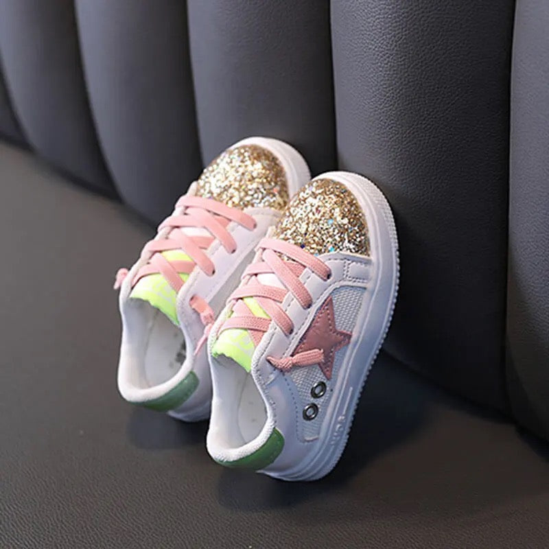 Tenis con estrella color rosa y brillo. Flexibles para un cómodo caminar.